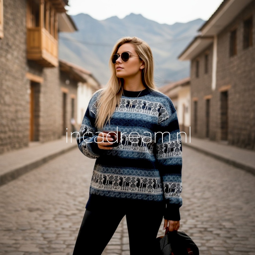 Warm und Weich Alpaka Pullover mit Kapuze für Damen . Anden Design mit Lamas und Geometrischen Details