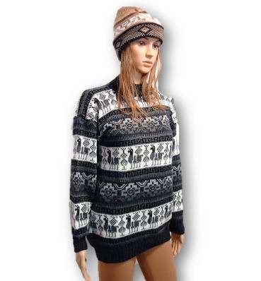 Warm und Weich Alpaka Pullover mit Kapuze für Damen . Anden Design mit Lamas und Geometrischen Details