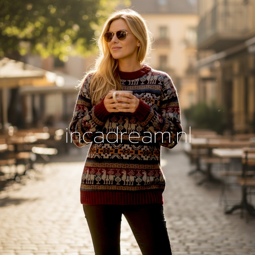 Warm und Weich Alpaka Pullover mit Kapuze für Damen . Anden Design mit Lamas und Geometrischen Details