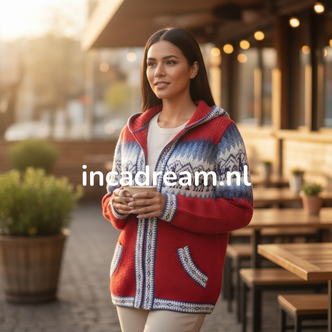 Strickjacke aus kostbarem Alpaka, Warm und Weich Alpaka Cardigan mit Reißverschluss und Kapuze für Damen . Anden Design mit Lamas und Geometrischen Details
