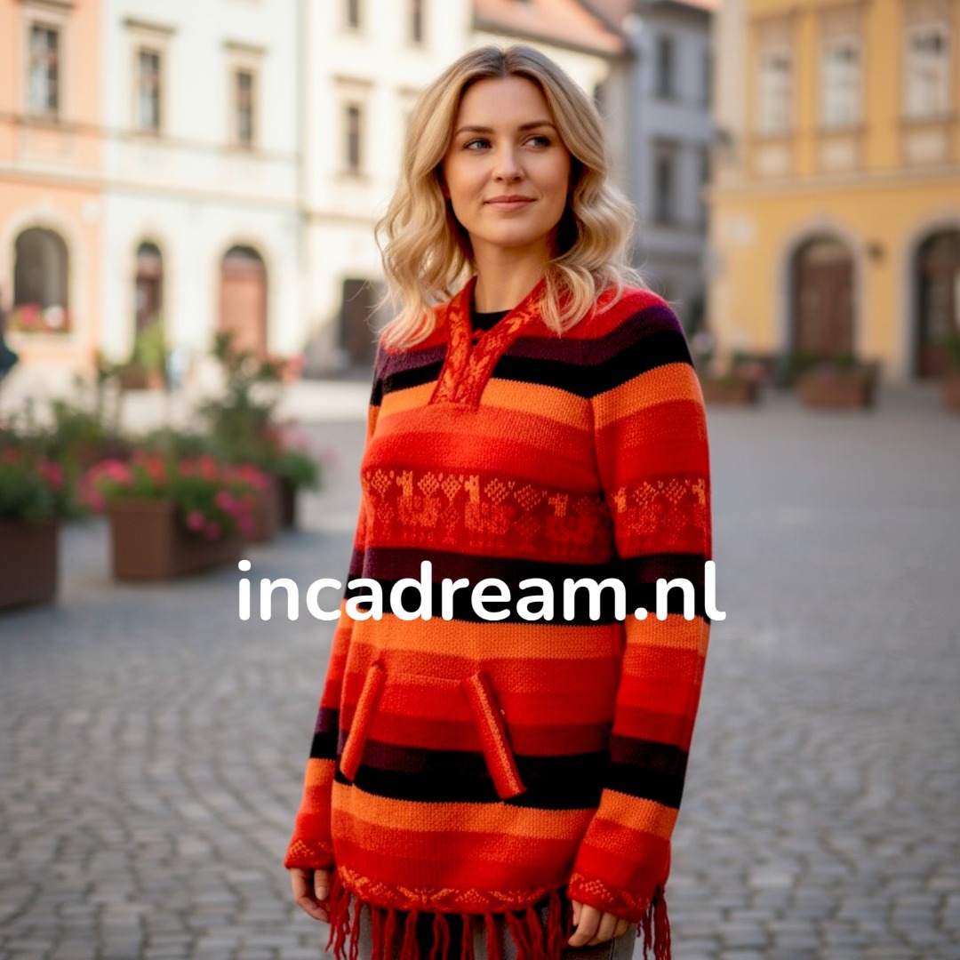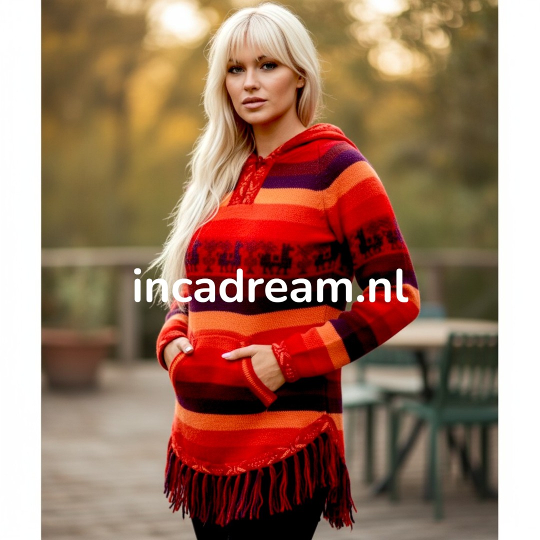 Warm und Weich Alpaka Pullover mit Kapuze für Damen . Anden Design mit Lamas und Geometrischen Details