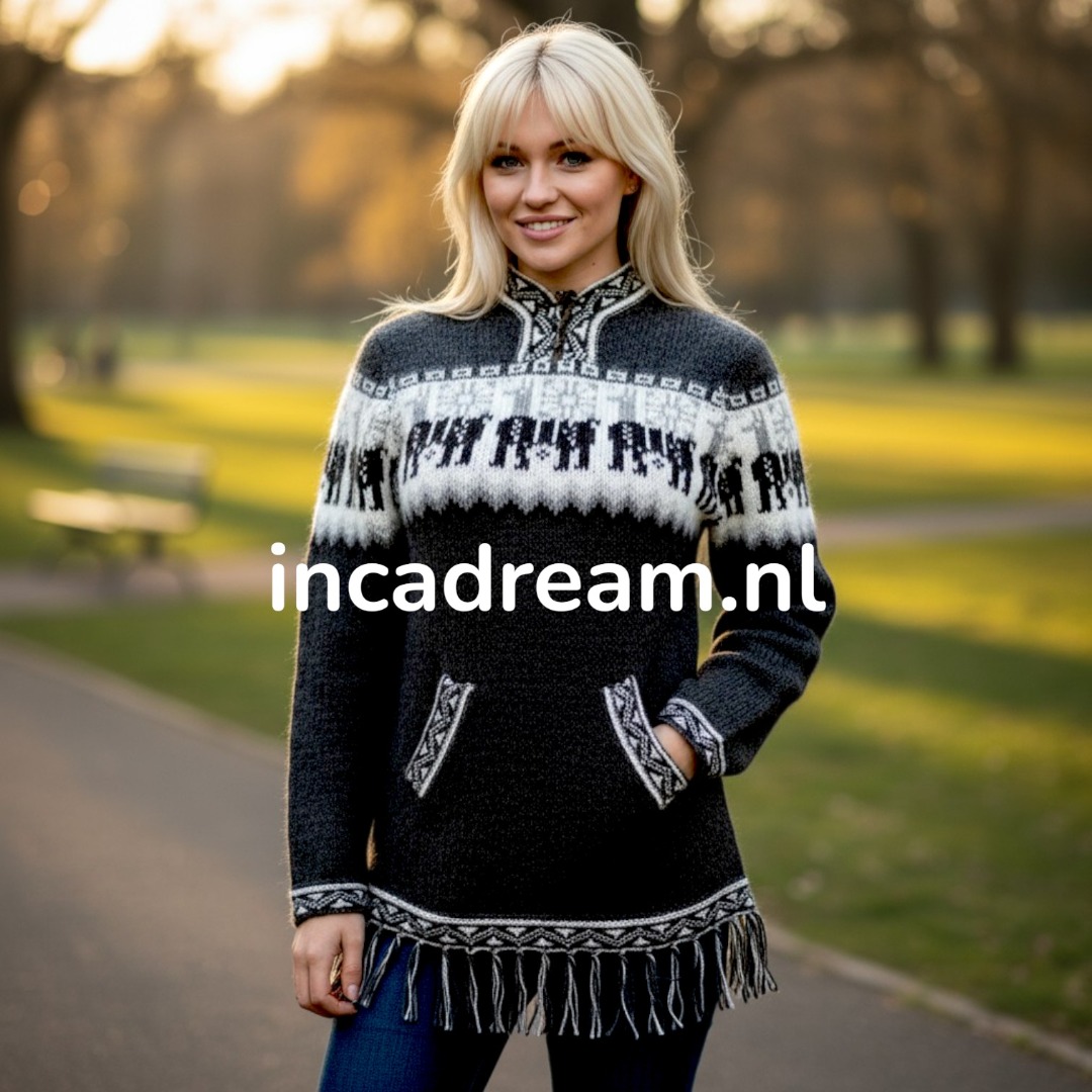 Warm und Weich Alpaka Pullover mit Kapuze für Damen . Anden Design mit Lamas und Geometrischen Details