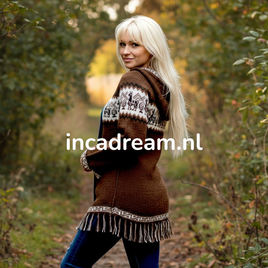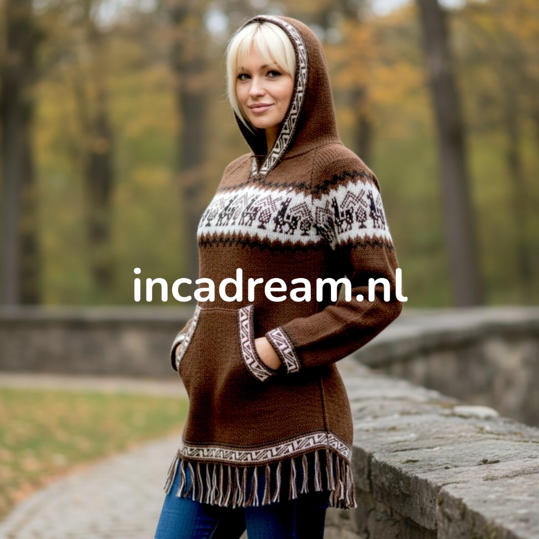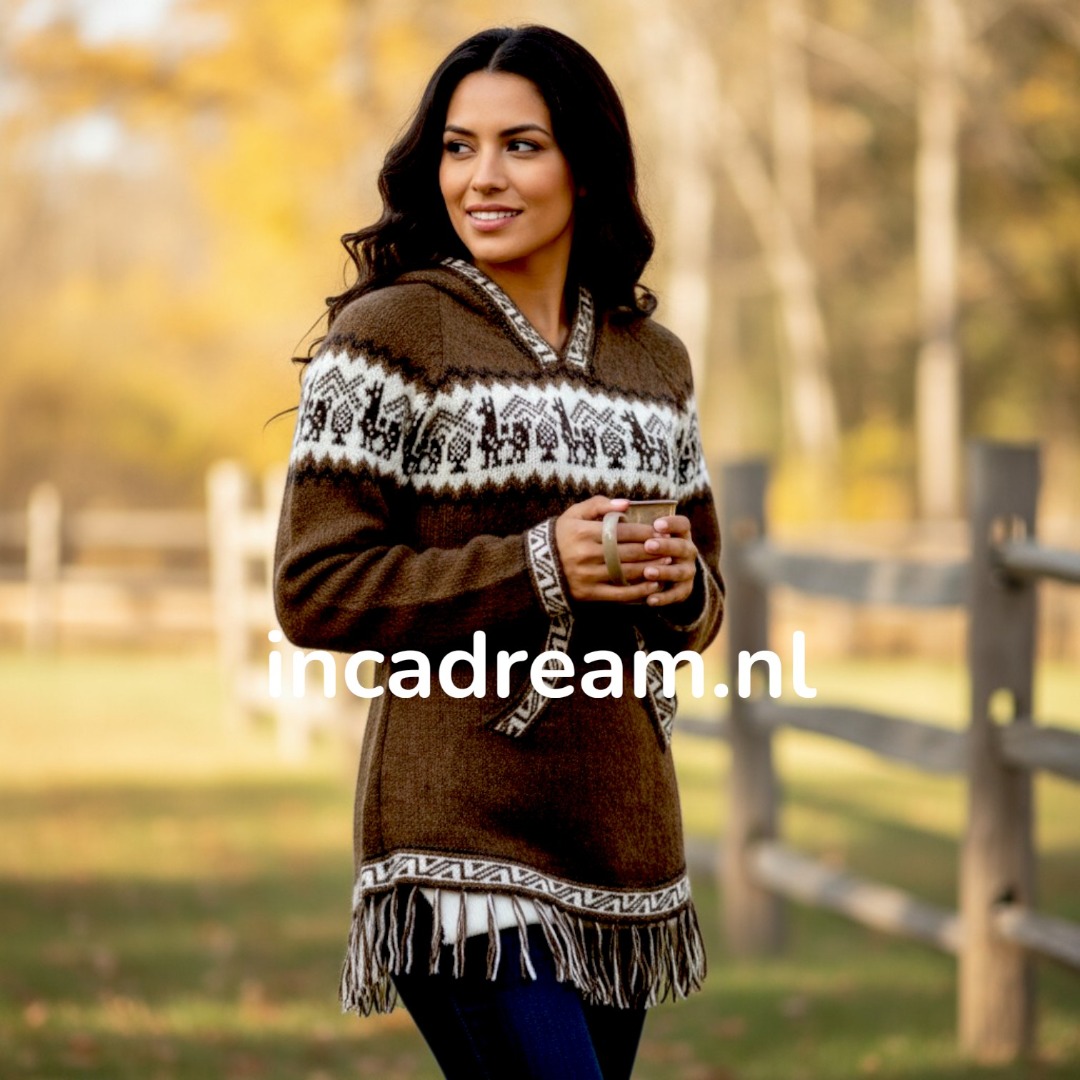 Warm und Weich Alpaka Pullover mit Kapuze für Damen . Anden Design mit Lamas und Geometrischen Details