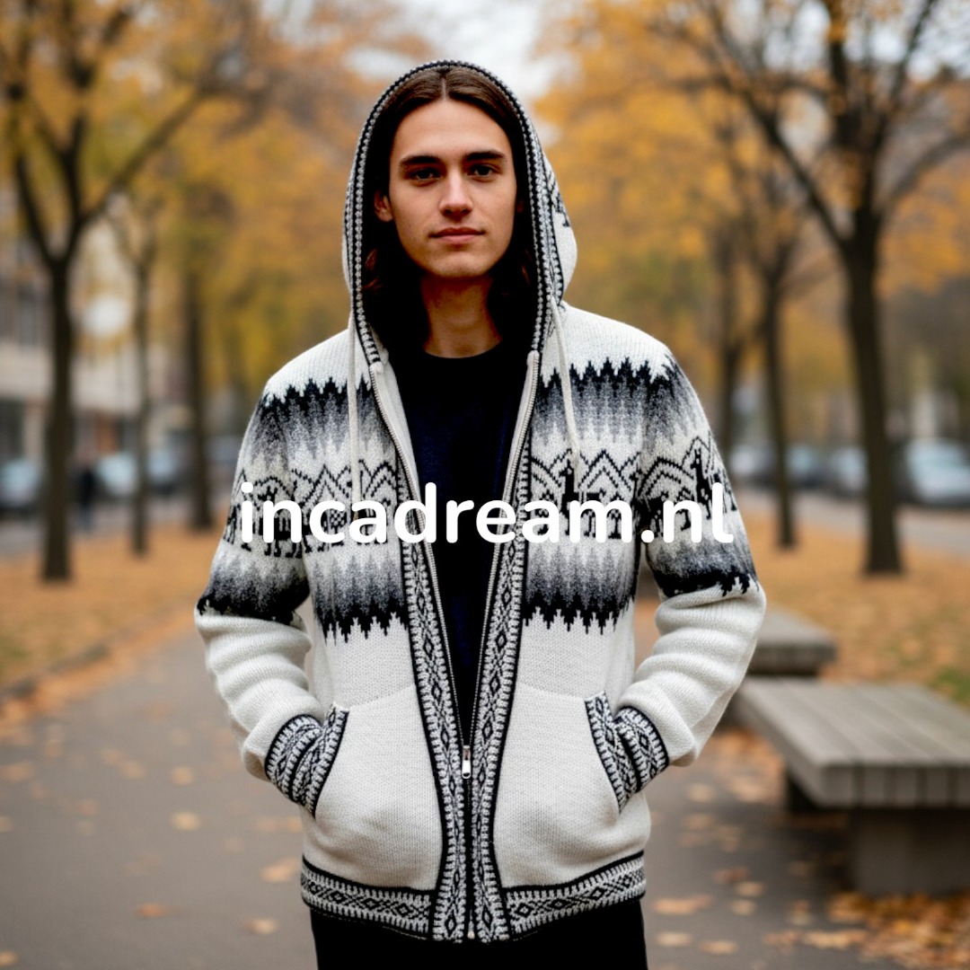 Strickjacke aus kostbarem Alpaka, Warm und Weich Alpaka Cardigan mit Reißverschluss und Kapuze für herren . Anden Design mit Lamas und Geometrischen Details