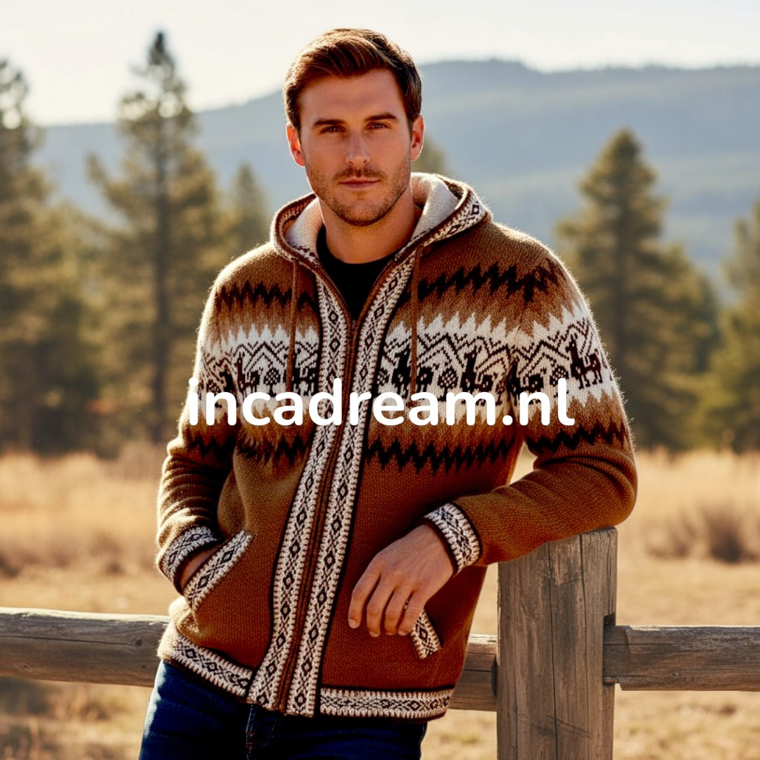 Strickjacke aus kostbarem Alpaka, Warm und Weich Alpaka Cardigan mit Reißverschluss und Kapuze für herren . Anden Design mit Lamas und Geometrischen Details