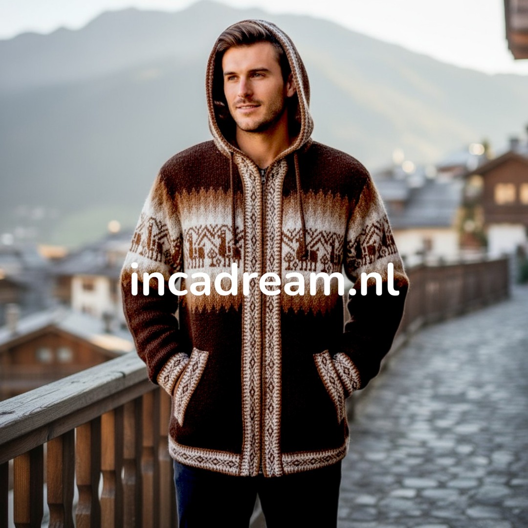 Strickjacke aus kostbarem Alpaka, Warm und Weich Alpaka Cardigan mit Reißverschluss und Kapuze für herren . Anden Design mit Lamas und Geometrischen Details