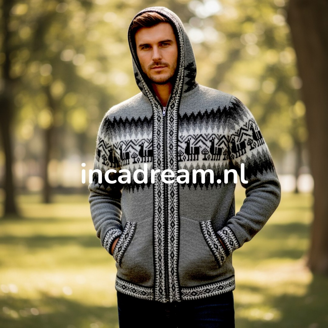 Strickjacke aus kostbarem Alpaka, Warm und Weich Alpaka Cardigan mit Reißverschluss und Kapuze für herren . Anden Design mit Lamas und Geometrischen Details