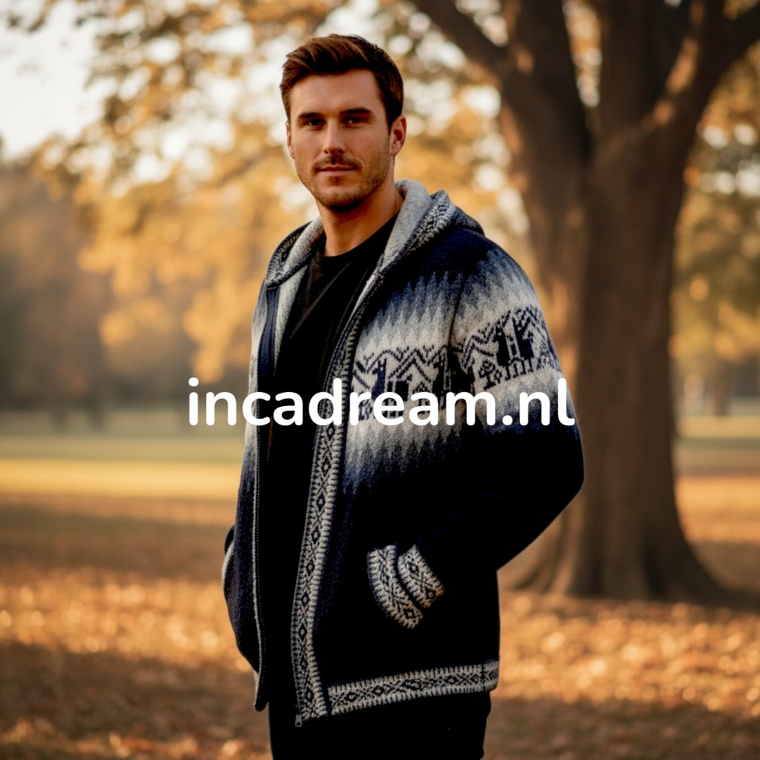 Strickjacke aus kostbarem Alpaka, Warm und Weich Alpaka Cardigan mit Reißverschluss und Kapuze für herren . Anden Design mit Lamas und Geometrischen Details