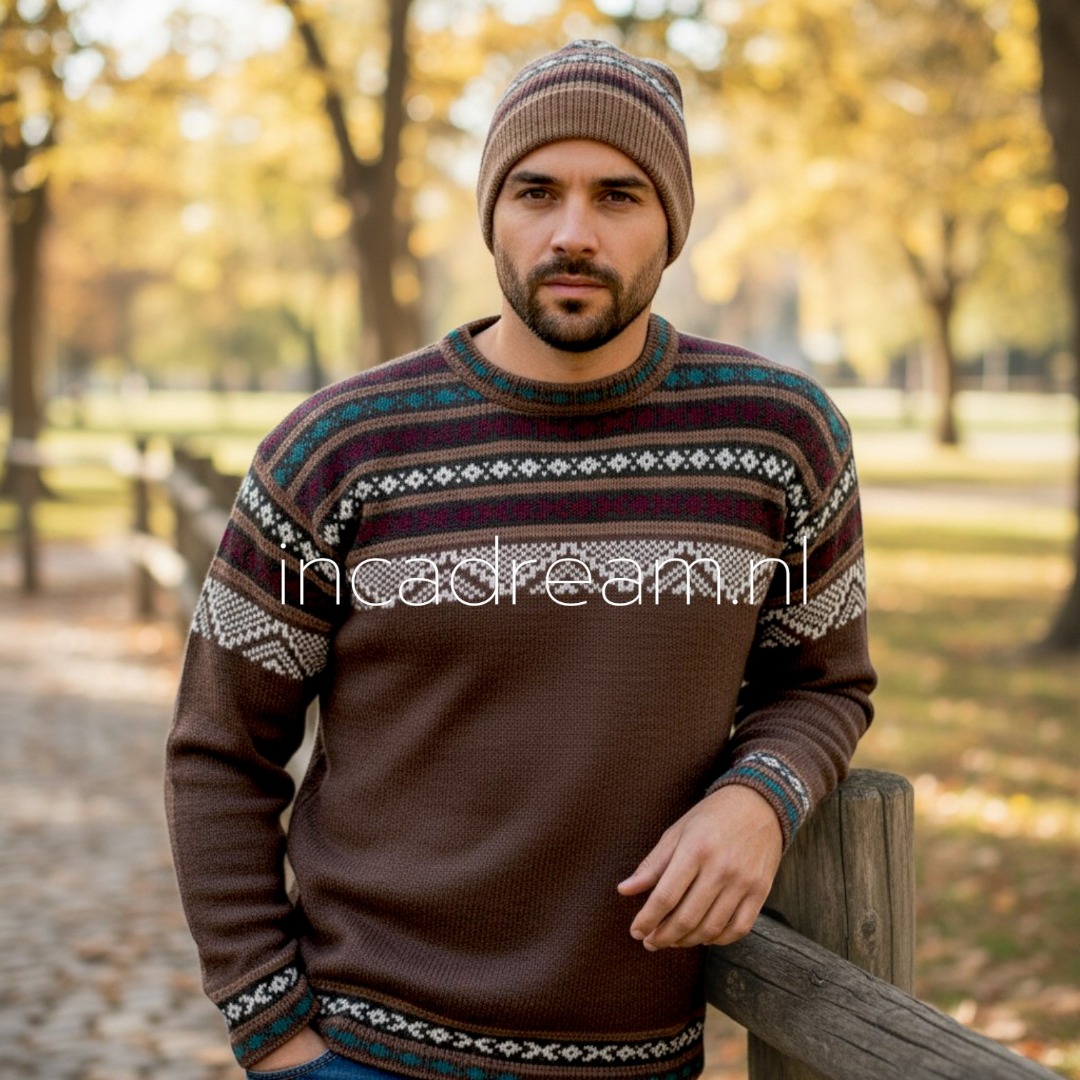 Herren Alpaka Pullover braun mit Andenmotiv an der Spitze