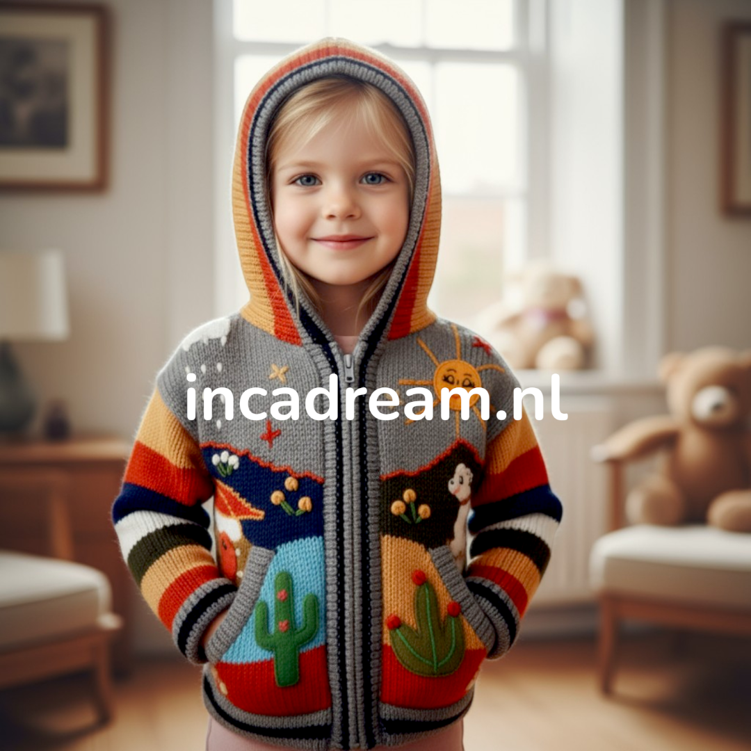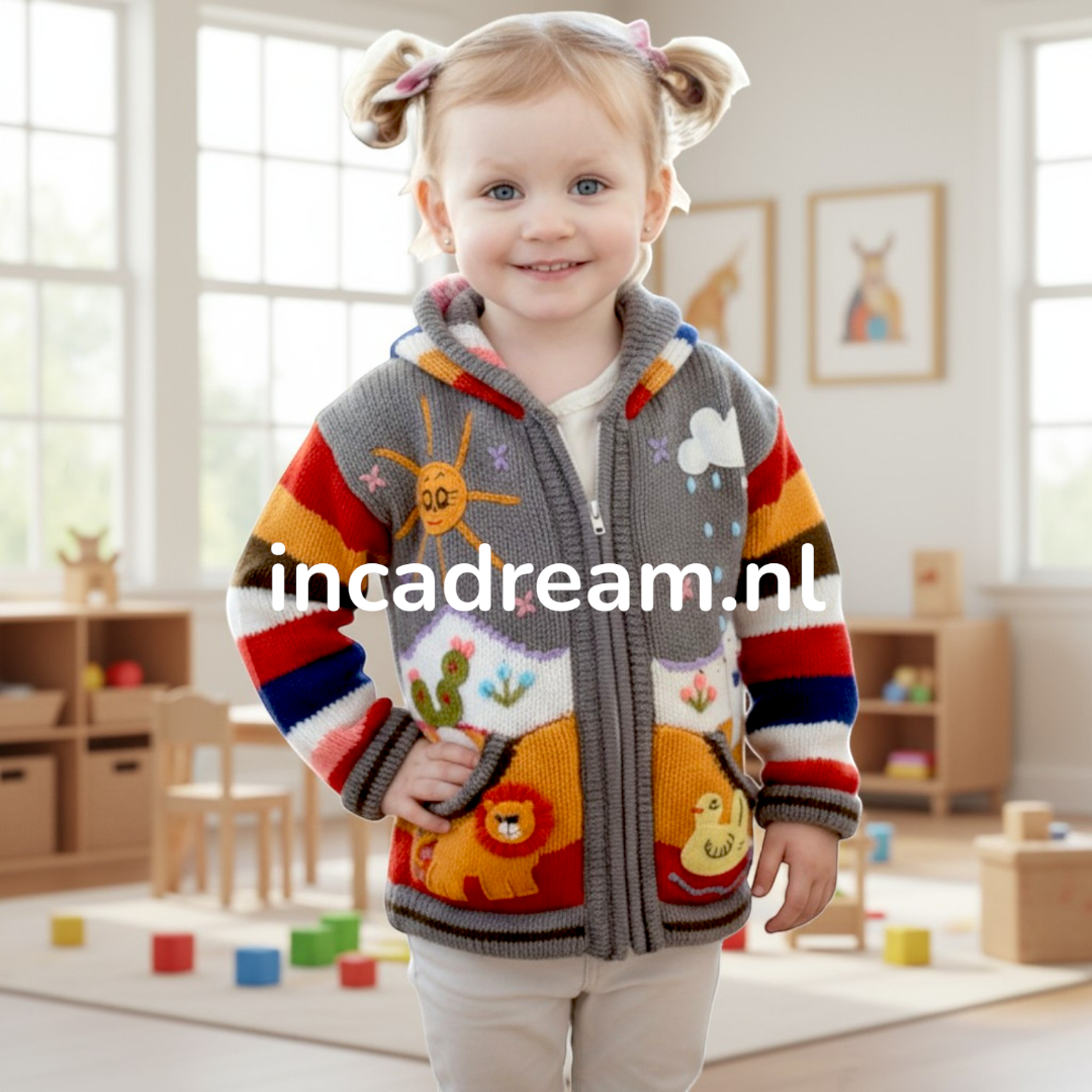 Peru Kinder Strickjacke Kapuze Handarbeit Peru Kinder Strickjacke Kapuze HandarbeitDiese liebevoll handgearbeitete Strickjacke für Ihren Jungen oder Ihr Mädchen ist ein echter Hingucker. Individuelle Motive machen diese Strickjacke zu einem echten Einzelstück, geeignet für einen Spaziergang in der Natur bei milden Temperaturen, für zu Hause aber auch ideal als Geschenk. Holen Sie sich Ihr Unikat für Ihr Kind.Kinder Strickjacke Unisex Bauernhof Tiere Kapuze Diese warme Wolljacke aus Peru wurde engmaschig gestrickt und ist besonders widerstandsfähig. Saum und Ärmelenden sind doppelt gestrickt. Sie hat zwei Taschen und lässt sich per Reißverschluss verschließen.Kinderstrickjacke Aus Peru Baby Mädchen Jungen Kapuze Tiermotive Handarbeit, Strick Kinderjacke Kapuze Mädchen Tiermotiv mehrfarbig bestickevtl. kann die Anordnung der Figuren ein klein wenig variieren(... dafür ist es ja Handarbeit)