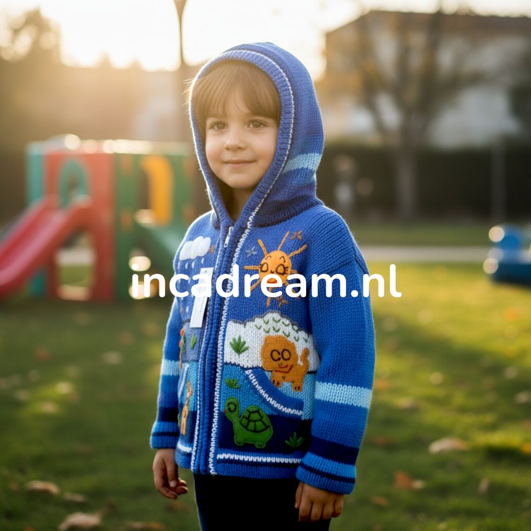 Peru Kinder Strickjacke Kapuze Handarbeit, Peru Kinder Strickjacke Kapuze, HandarbeitDiese liebevoll handgearbeitete Strickjacke für Ihren Jungen oder Ihr Mädchen ist ein echter Hingucker. Individuelle Motive machen diese Strickjacke zu einem echten Einzelstück, geeignet für einen Spaziergang in der Natur bei milden Temperaturen, für zu Hause aber auch ideal als Geschenk. Holen Sie sich Ihr Unikat für Ihr Kind.Kinder Strickjacke Unisex Bauernhof Tiere Kapuze Diese warme Wolljacke aus Peru wurde engmaschig gestrickt und ist besonders widerstandsfähig. Saum und Ärmelenden sind doppelt gestrickt. Sie hat zwei Taschen und lässt sich per Reißverschluss verschließen.Kinderstrickjacke Aus Peru Baby Mädchen Jungen Kapuze Tiermotive Handarbeit, Strick Kinderjacke Kapuze Mädchen Tiermotiv mehrfarbig bestickevtl. kann die Anordnung der Figuren ein klein wenig variieren(... dafür ist es ja Handarbeit)