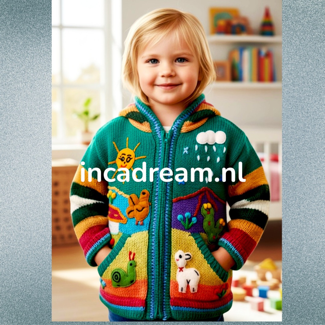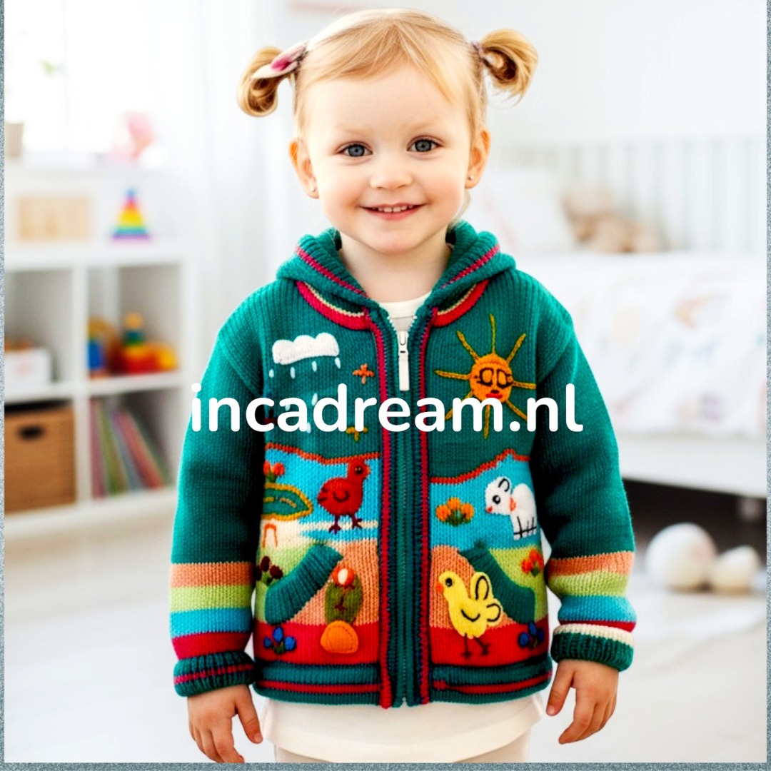 Peru Kinder Strickjacke Kapuze Handarbeit, Peru Kinder Strickjacke Kapuze, HandarbeitDiese liebevoll handgearbeitete Strickjacke für Ihren Jungen oder Ihr Mädchen ist ein echter Hingucker. Individuelle Motive machen diese Strickjacke zu einem echten Einzelstück, geeignet für einen Spaziergang in der Natur bei milden Temperaturen, für zu Hause aber auch ideal als Geschenk. Holen Sie sich Ihr Unikat für Ihr Kind.Kinder Strickjacke Unisex Bauernhof Tiere Kapuze Diese warme Wolljacke aus Peru wurde engmaschig gestrickt und ist besonders widerstandsfähig. Saum und Ärmelenden sind doppelt gestrickt. Sie hat zwei Taschen und lässt sich per Reißverschluss verschließen.Kinderstrickjacke Aus Peru Baby Mädchen Jungen Kapuze Tiermotive Handarbeit, Strick Kinderjacke Kapuze Mädchen Tiermotiv mehrfarbig bestickevtl. kann die Anordnung der Figuren ein klein wenig variieren(... dafür ist es ja Handarbeit)