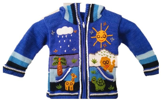 Peru Kinder Strickjacke Kapuze  Handarbeit Peru Kinder Strickjacke Kapuze  HandarbeitDiese liebevoll handgearbeitete Strickjacke für Ihren Jungen oder Ihr Mädchen ist ein echter Hingucker. Individuelle Motive machen diese Strickjacke zu einem echten Einzelstück, geeignet für einen Spaziergang in der Natur bei milden Temperaturen, für zu Hause aber auch ideal als Geschenk. Holen Sie sich Ihr Unikat für Ihr Kind.Kinder Strickjacke Unisex Bauernhof Tiere Kapuze Diese warme Wolljacke aus Peru wurde engmaschig gestrickt und ist besonders widerstandsfähig. Saum und Ärmelenden sind doppelt gestrickt. Sie hat zwei Taschen und lässt sich per Reißverschluss verschließen.Kinderstrickjacke Aus Peru Baby Mädchen Jungen Kapuze Tiermotive Handarbeit, Strick Kinderjacke Kapuze Mädchen Tiermotiv mehrfarbig bestickevtl. kann die Anordnung der Figuren ein klein wenig variieren(... dafür ist es ja Handarbeit)
