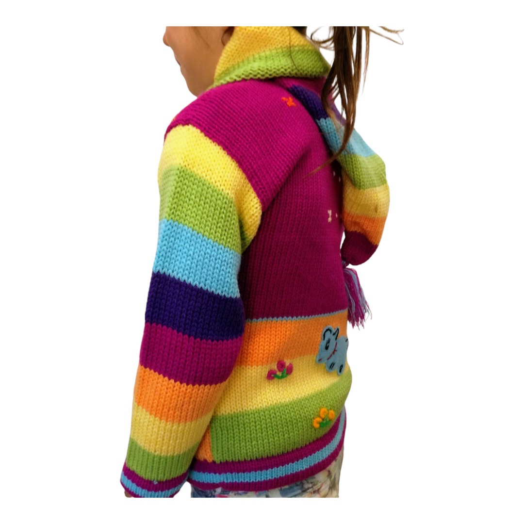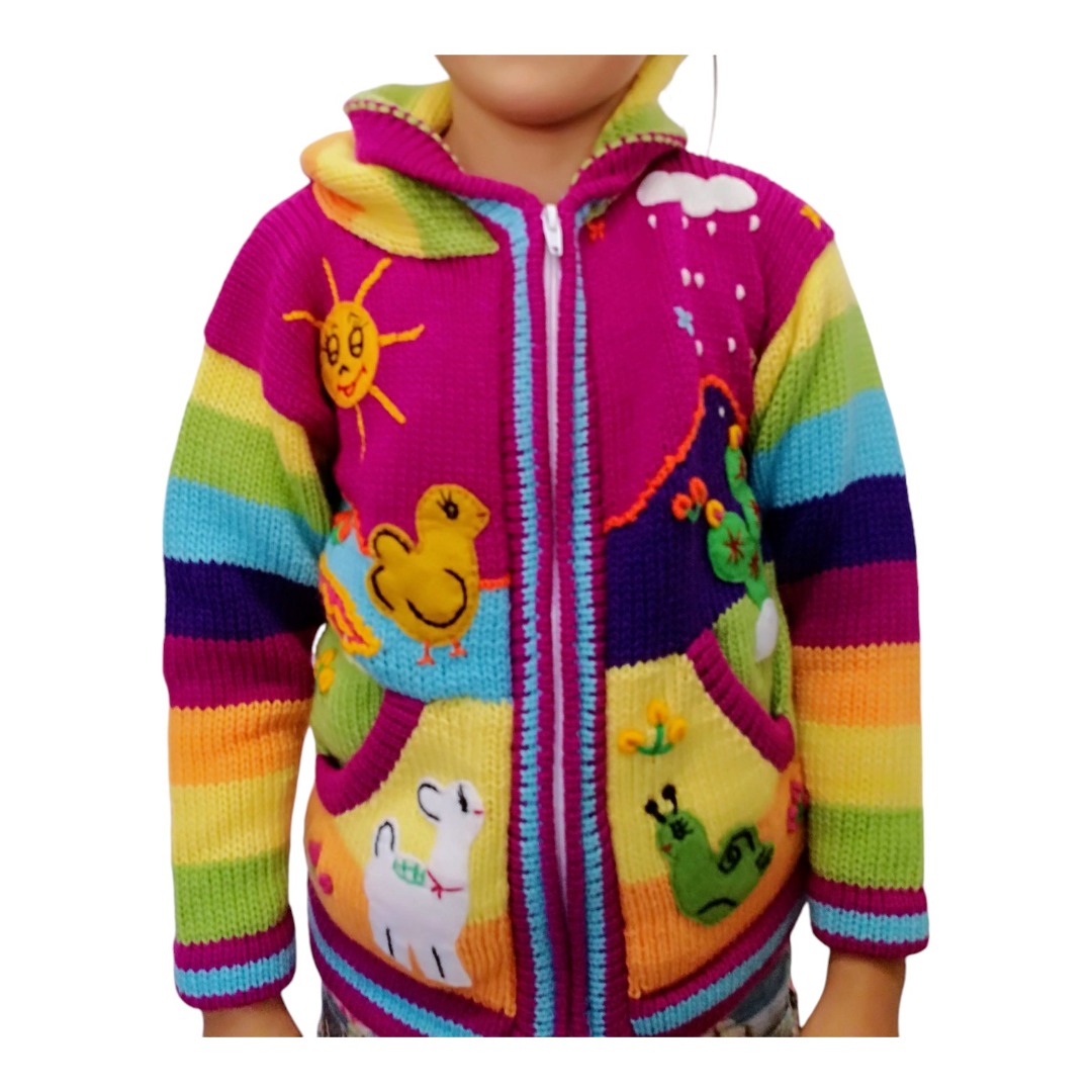 Peru Kinder Strickjacke Kapuze  Handarbeit, Peru Kinder Strickjacke Kapuze,  HandarbeitDiese liebevoll handgearbeitete Strickjacke für Ihren Jungen oder Ihr Mädchen ist ein echter Hingucker. Individuelle Motive machen diese Strickjacke zu einem echten Einzelstück, geeignet für einen Spaziergang in der Natur bei milden Temperaturen, für zu Hause aber auch ideal als Geschenk. Holen Sie sich Ihr Unikat für Ihr Kind.Kinder Strickjacke Unisex Bauernhof Tiere Kapuze Diese warme Wolljacke aus Peru wurde engmaschig gestrickt und ist besonders widerstandsfähig. Saum und Ärmelenden sind doppelt gestrickt. Sie hat zwei Taschen und lässt sich per Reißverschluss verschließen.Kinderstrickjacke Aus Peru Baby Mädchen Jungen Kapuze Tiermotive Handarbeit, Strick Kinderjacke Kapuze Mädchen Tiermotiv mehrfarbig bestickevtl. kann die Anordnung der Figuren ein klein wenig variieren(... dafür ist es ja Handarbeit)