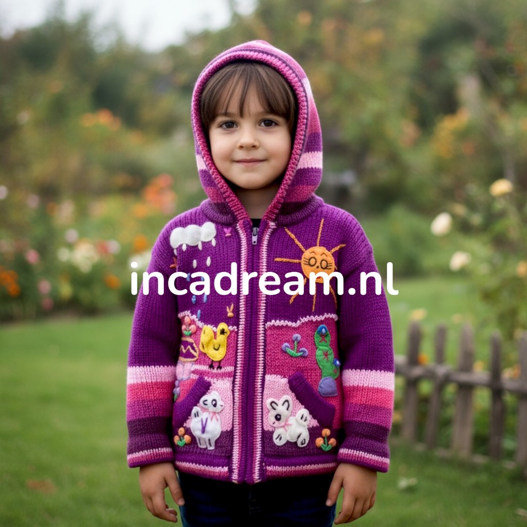 Peru Kinder Strickjacke Kapuze Handarbeit Peru Kinder Strickjacke Kapuze HandarbeitDiese liebevoll handgearbeitete Strickjacke für Ihren Jungen oder Ihr Mädchen ist ein echter Hingucker. Individuelle Motive machen diese Strickjacke zu einem echten Einzelstück, geeignet für einen Spaziergang in der Natur bei milden Temperaturen, für zu Hause aber auch ideal als Geschenk. Holen Sie sich Ihr Unikat für Ihr Kind.Kinder Strickjacke Unisex Bauernhof Tiere Kapuze Diese warme Wolljacke aus Peru wurde engmaschig gestrickt und ist besonders widerstandsfähig. Saum und Ärmelenden sind doppelt gestrickt. Sie hat zwei Taschen und lässt sich per Reißverschluss verschließen.Kinderstrickjacke Aus Peru Baby Mädchen Jungen Kapuze Tiermotive Handarbeit, Strick Kinderjacke Kapuze Mädchen Tiermotiv mehrfarbig bestickevtl. kann die Anordnung der Figuren ein klein wenig variieren(... dafür ist es ja Handarbeit)
