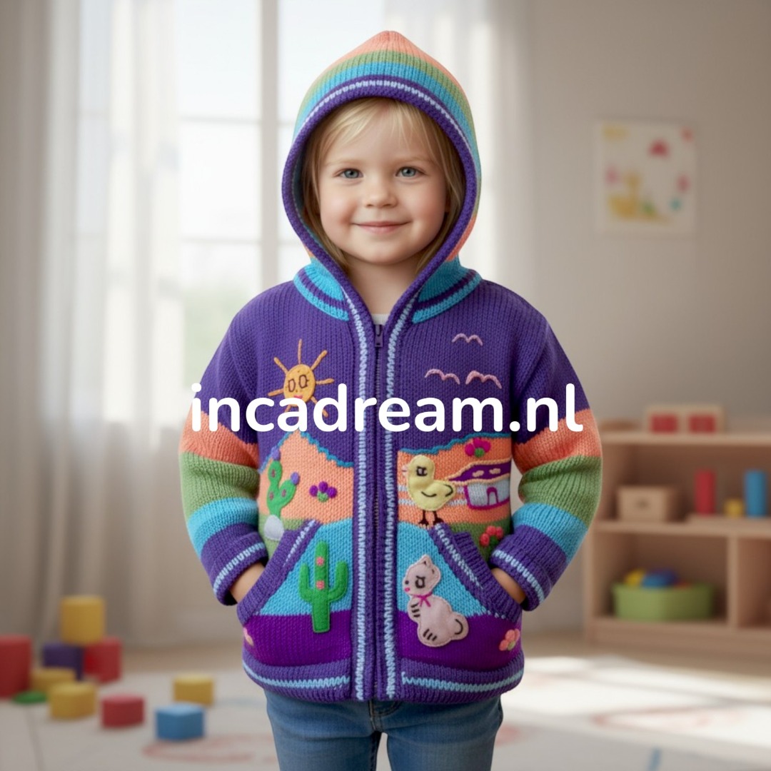 Peru Kinder Strickjacke Kapuze  HandarbeitPeru Kinder Strickjacke Kapuze  HandarbeitDiese liebevoll handgearbeitete Strickjacke für Ihren Jungen oder Ihr Mädchen ist ein echter Hingucker. Individuelle Motive machen diese Strickjacke zu einem echten Einzelstück, geeignet für einen Spaziergang in der Natur bei milden Temperaturen, für zu Hause aber auch ideal als Geschenk. Holen Sie sich Ihr Unikat für Ihr Kind.Kinder Strickjacke Unisex Bauernhof Tiere Kapuze Diese warme Wolljacke aus Peru wurde engmaschig gestrickt und ist besonders widerstandsfähig. Saum und Ärmelenden sind doppelt gestrickt. Sie hat zwei Taschen und lässt sich per Reißverschluss verschließen.Kinderstrickjacke Aus Peru Baby Mädchen Jungen Kapuze Tiermotive Handarbeit, Strick Kinderjacke Kapuze Mädchen Tiermotiv mehrfarbig bestickevtl. kann die Anordnung der Figuren ein klein wenig variieren(... dafür ist es ja Handarbeit)