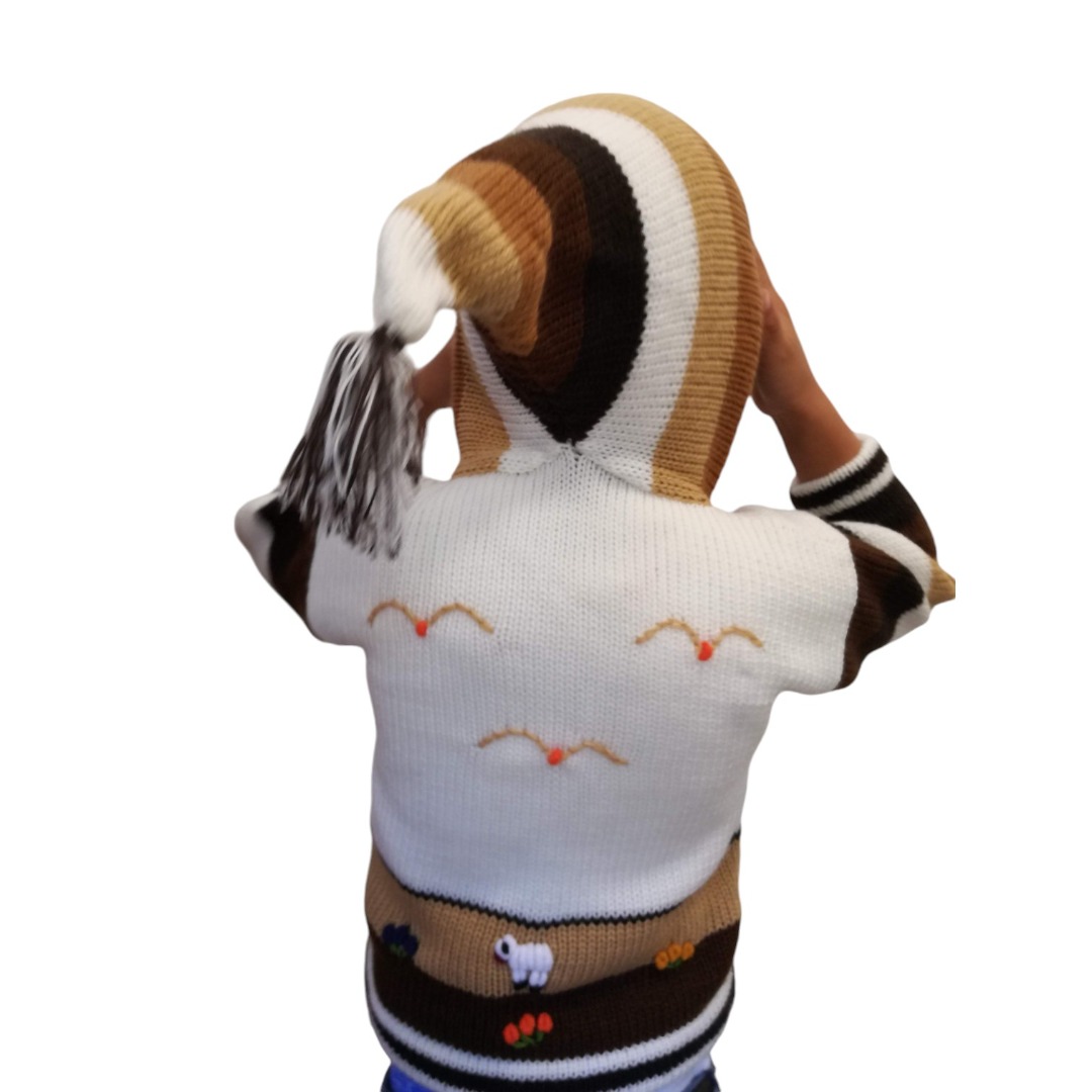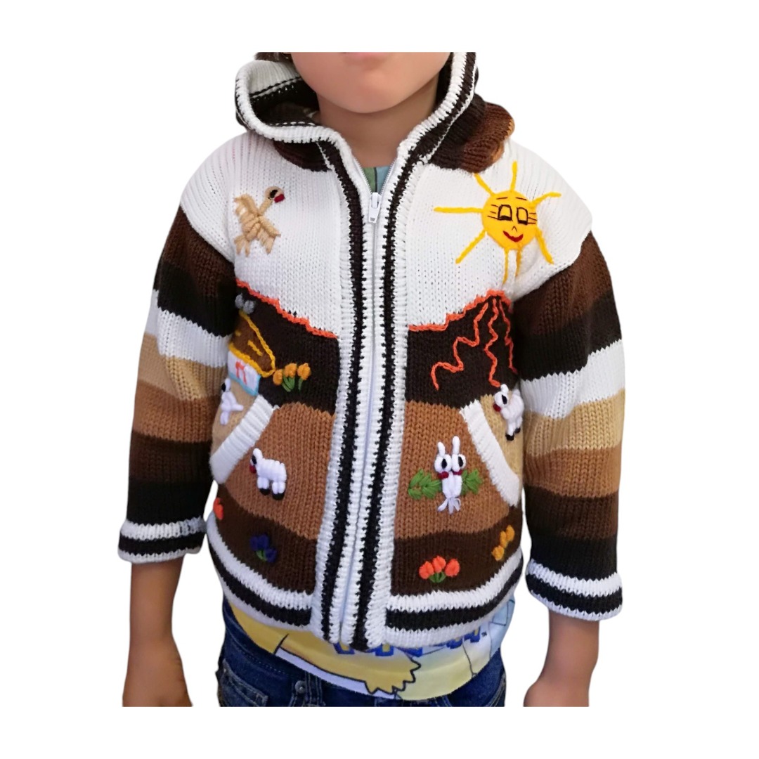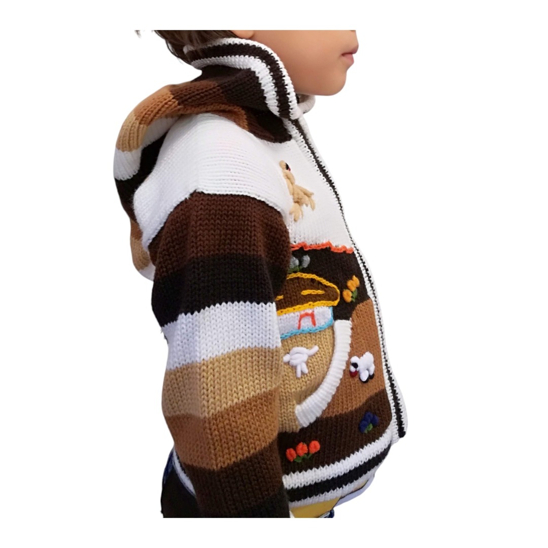 Peru Kinder Strickjacke Kapuze Handarbeit Peru Kinder Strickjacke Kapuze HandarbeitDiese liebevoll handgearbeitete Strickjacke für Ihren Jungen oder Ihr Mädchen ist ein echter Hingucker. Individuelle Motive machen diese Strickjacke zu einem echten Einzelstück, geeignet für einen Spaziergang in der Natur bei milden Temperaturen, für zu Hause aber auch ideal als Geschenk. Holen Sie sich Ihr Unikat für Ihr Kind.Kinder Strickjacke Unisex Bauernhof Tiere Kapuze Diese warme Wolljacke aus Peru wurde engmaschig gestrickt und ist besonders widerstandsfähig. Saum und Ärmelenden sind doppelt gestrickt. Sie hat zwei Taschen und lässt sich per Reißverschluss verschließen.Kinderstrickjacke Aus Peru Baby Mädchen Jungen Kapuze Tiermotive Handarbeit, Strick Kinderjacke Kapuze Mädchen Tiermotiv mehrfarbig bestickevtl. kann die Anordnung der Figuren ein klein wenig variieren(... dafür ist es ja Handarbeit)