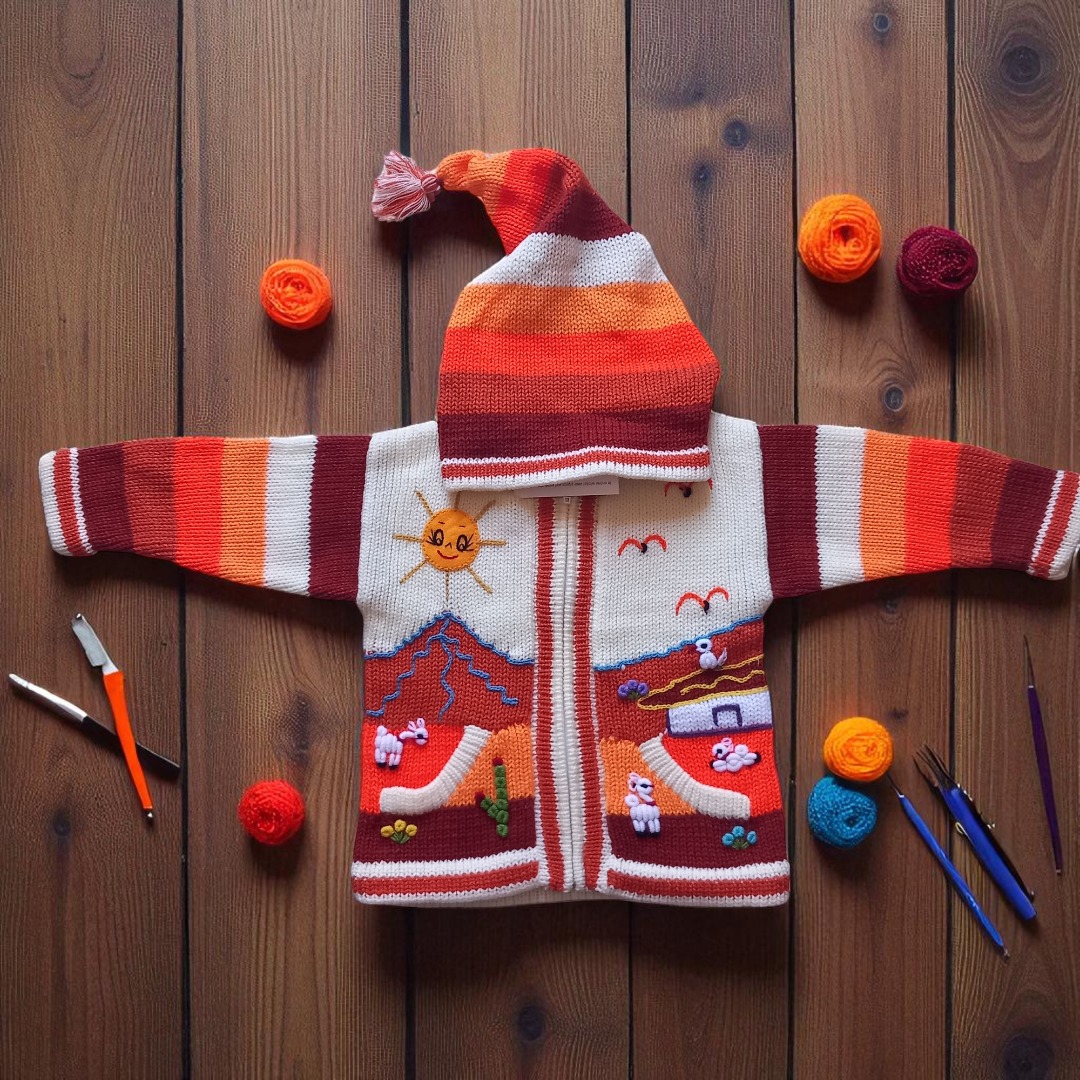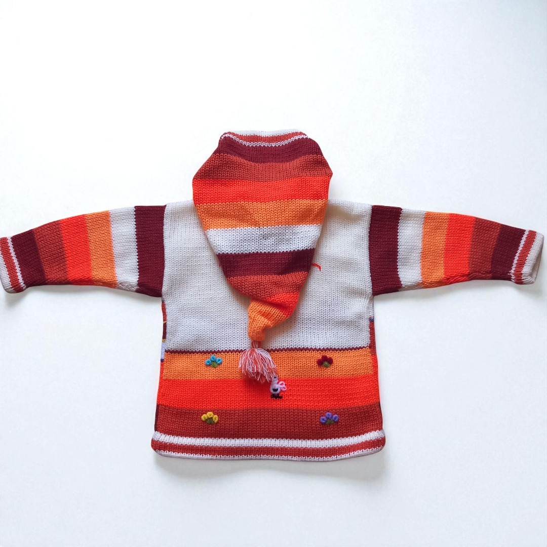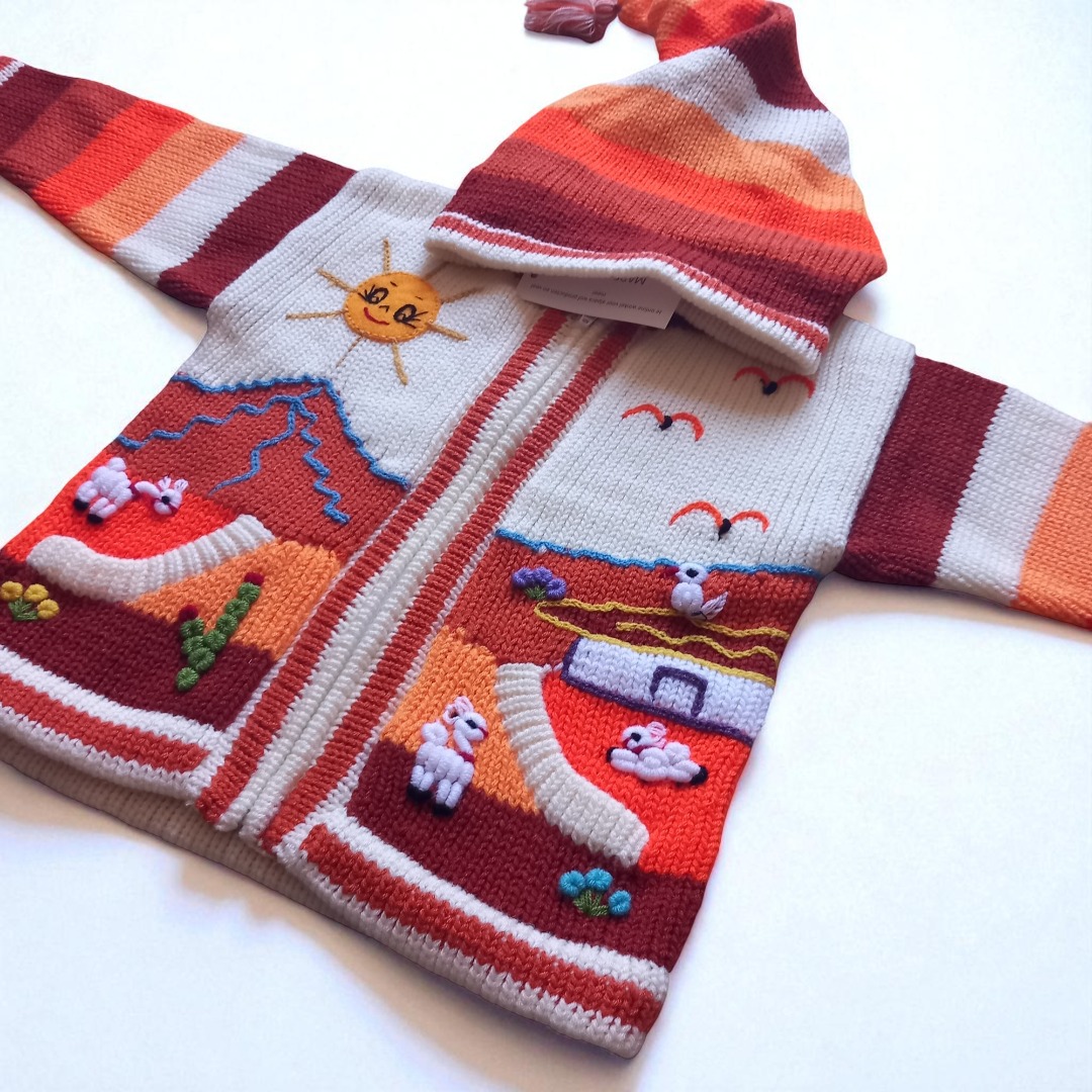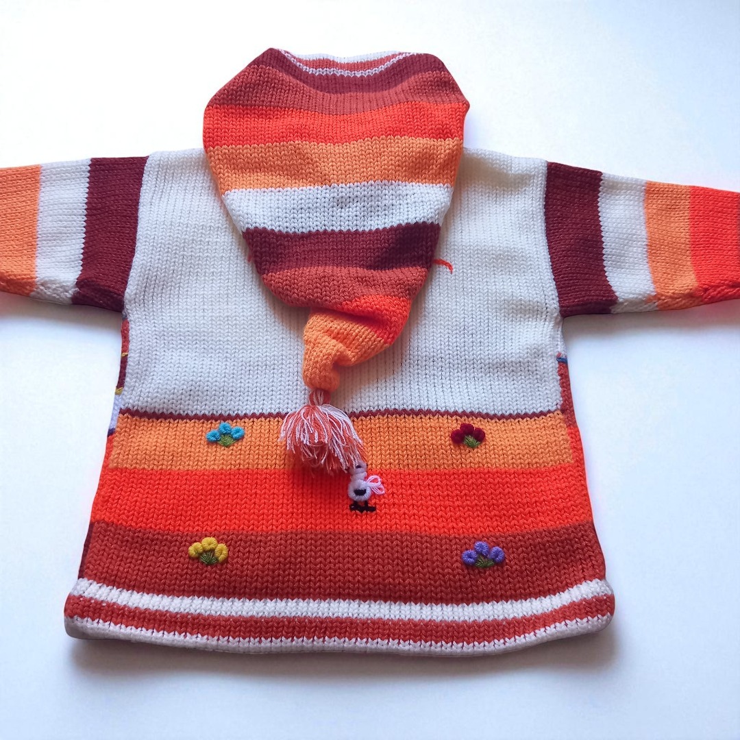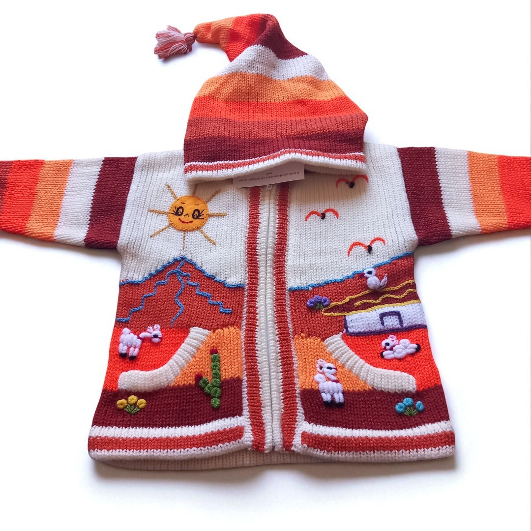 Peru Kinder Strickjacke Kapuze HandarbeitPeru Kinder Strickjacke Kapuze HandarbeitDiese liebevoll handgearbeitete Strickjacke für Ihren Jungen oder Ihr Mädchen ist ein echter Hingucker. Individuelle Motive machen diese Strickjacke zu einem echten Einzelstück, geeignet für einen Spaziergang in der Natur bei milden Temperaturen, für zu Hause aber auch ideal als Geschenk. Holen Sie sich Ihr Unikat für Ihr Kind.Kinder Strickjacke Unisex Bauernhof Tiere Kapuze Diese warme Wolljacke aus Peru wurde engmaschig gestrickt und ist besonders widerstandsfähig. Saum und Ärmelenden sind doppelt gestrickt. Sie hat zwei Taschen und lässt sich per Reißverschluss verschließen.Kinderstrickjacke Aus Peru Baby Mädchen Jungen Kapuze Tiermotive Handarbeit, Strick Kinderjacke Kapuze Mädchen Tiermotiv mehrfarbig bestickevtl. kann die Anordnung der Figuren ein klein wenig variieren(... dafür ist es ja Handarbeit)